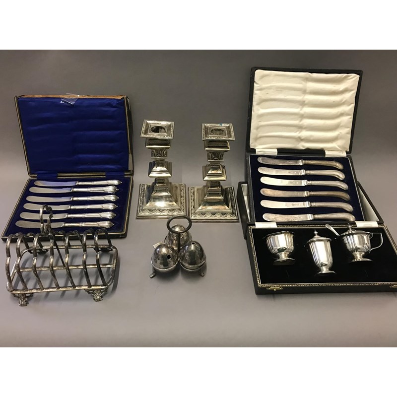 Platedware: Pair Dwarf Candlesticks, Toast Rack, Cased Cruet and Two Boxed Sets of Silver Handled Tea Knives