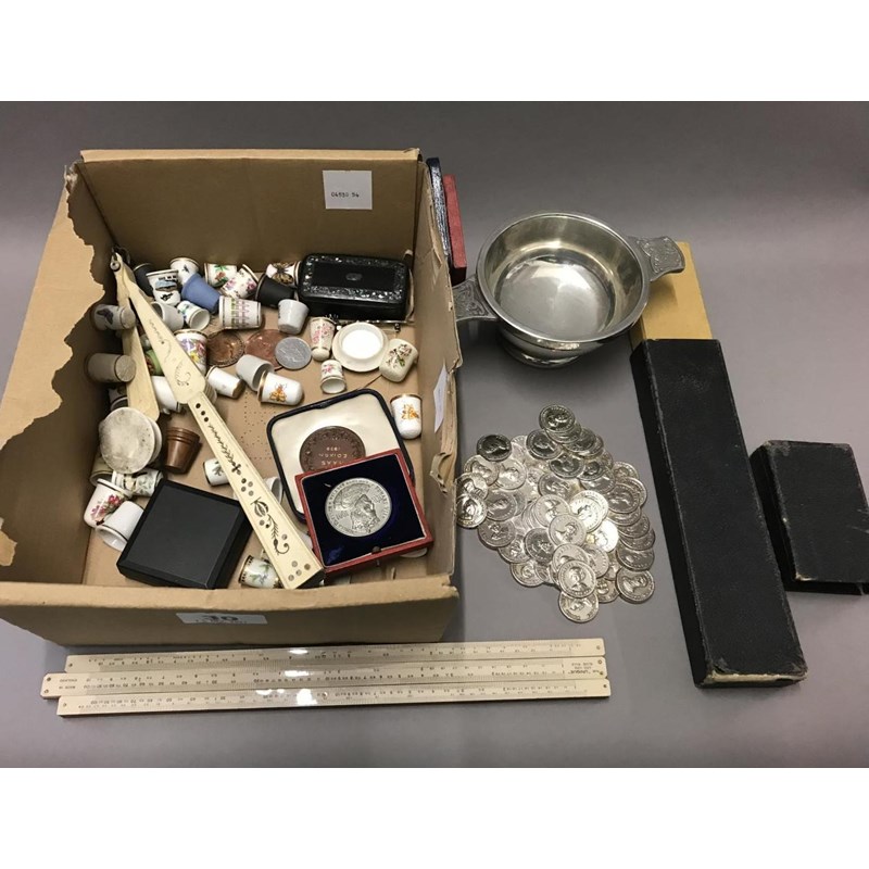 Box of Assorted Collectables to include some Silver, Thimbles, Fans and Coins etc