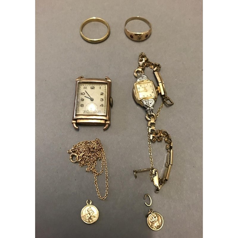 15ct Gold Chain, Watches by Bulova and Two Rings