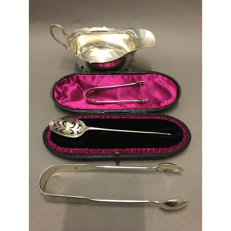 Silver Sauce Boat, Two Tongs and a Cased Spoon