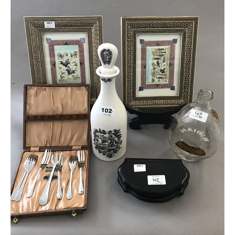 Coalport Bottle, Haigs Dimple Bottle, Plated Cutlery, Box of Costume Jewellery and Two Oriental Style Prints