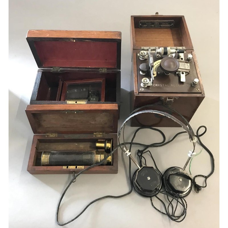 BBC Crystal Receiver, Pocket Telescope, and a Music Box Movement in a Wooden Box