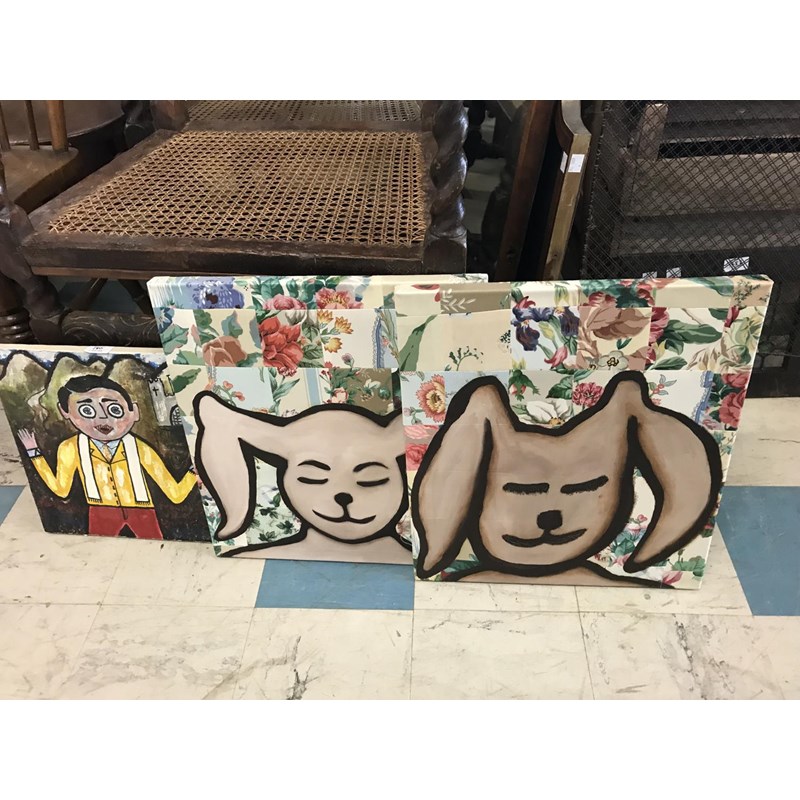 Kate Corder, `Portrait of a Rabbit 1 & 2`, Oils on Patchwork; & `Frank Sidebottom` by another hand, 1987-2002