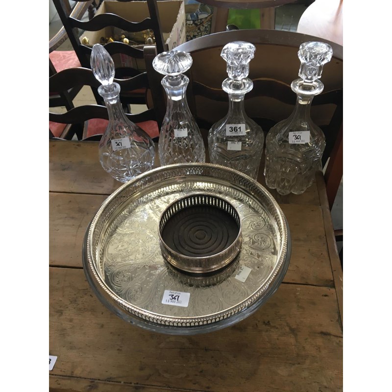 Qty of Assorted Glass Decanters, Glass Bowl and Two Plated Dishes