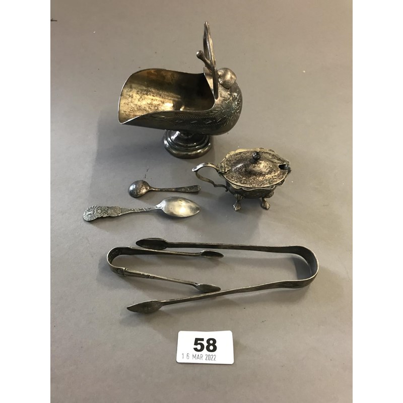 American Silver Spoon, Two Silver Sugar Tongs and Two Plated Items (5)