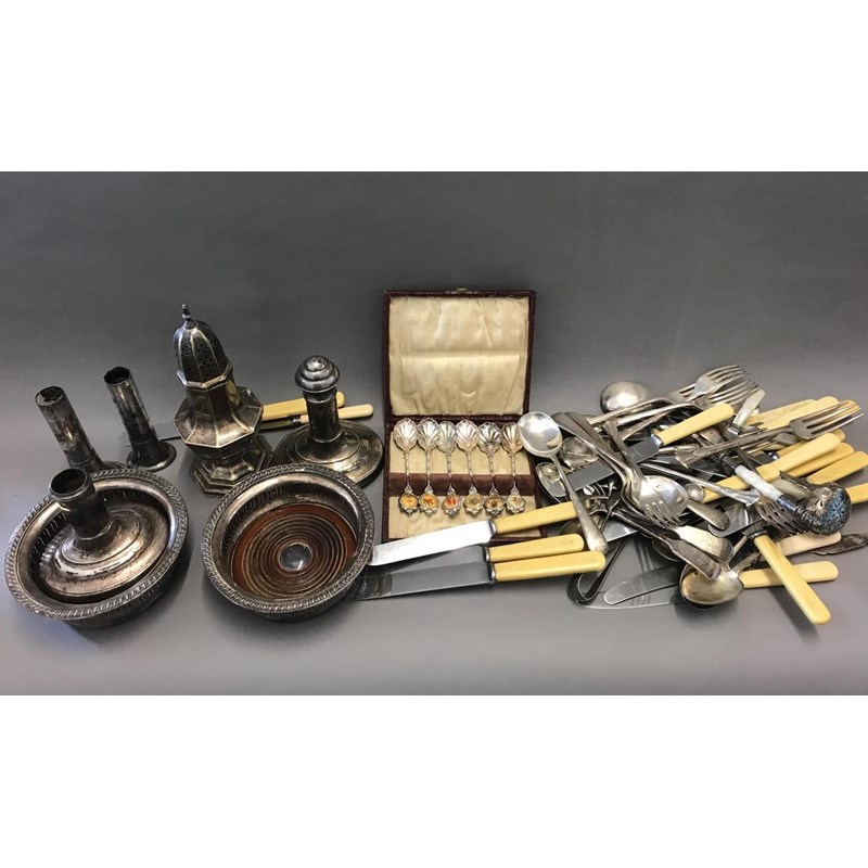 Pair of Plated Coasters, Sugar Shaker, Candlesticks and Flatware etc