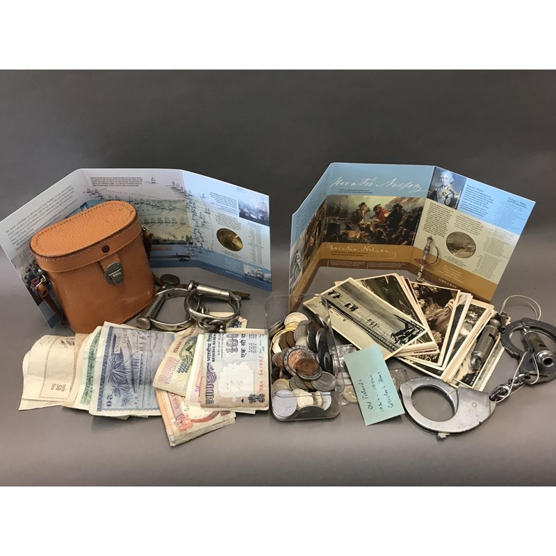 Mixed Lot: Coins, Binoculars, Handcuffs, Postcards etc