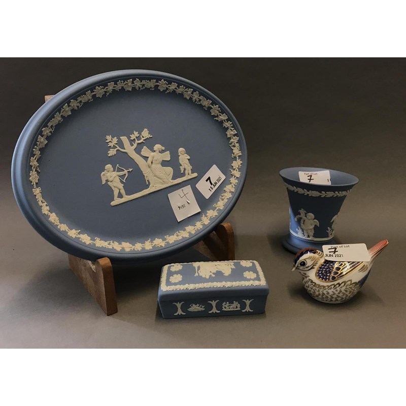 Crown Derby Bird Paperweight and Three Items of Wedgwood