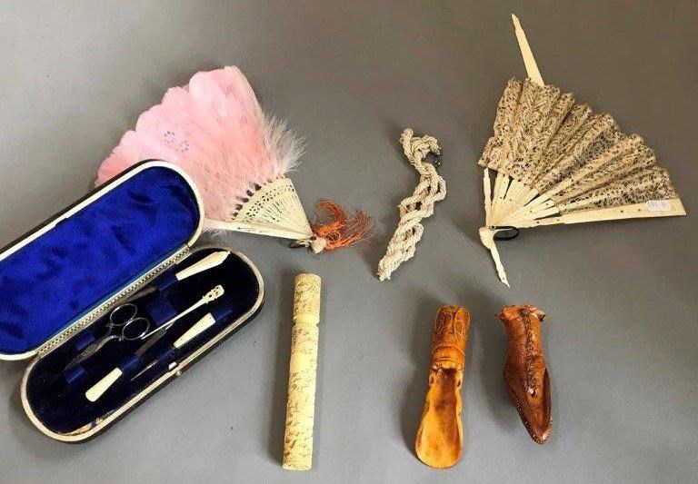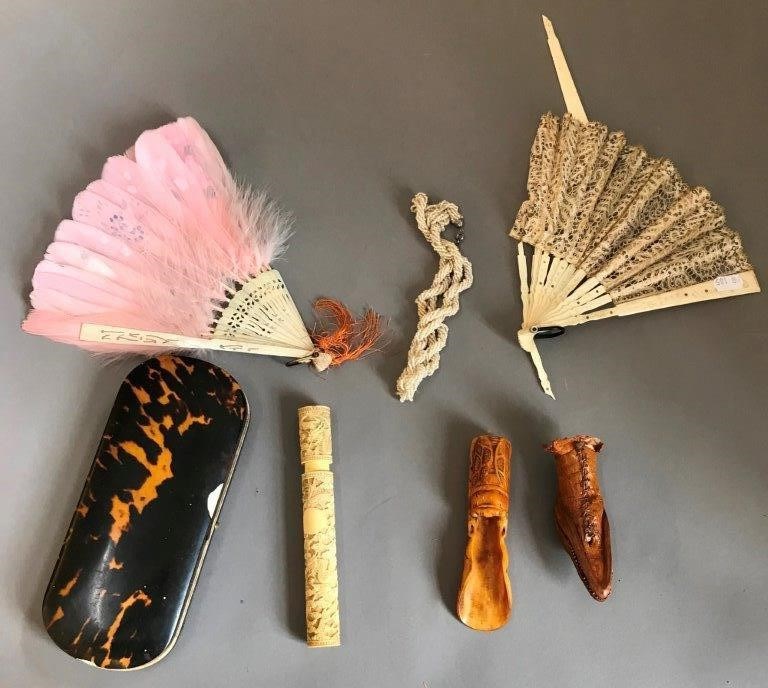 Carved Needle Case, Sewing Compendium and Fans, etc