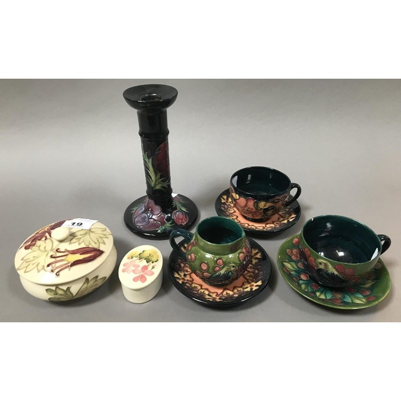 Various Items of Modern Moorcroft to include a Finches Milk Jug and a Cup and Saucer and a Lidded Bowl, etc, Height of Tallest 21cm