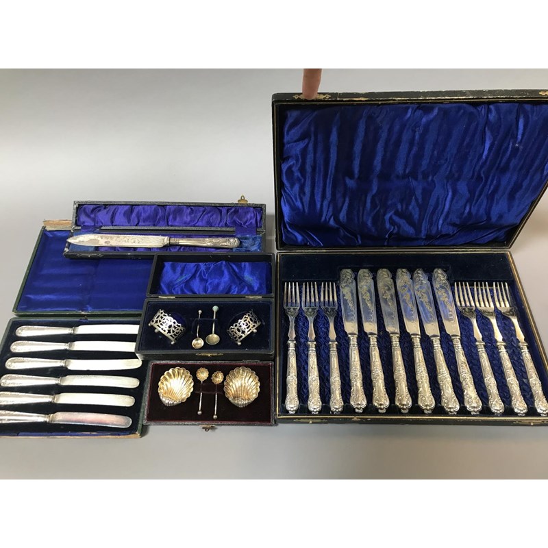 Cased Set of Silver Handled Fish Knives and Forks, Two Cased Silver Salts, Bread Knife and Cased Tea Knives