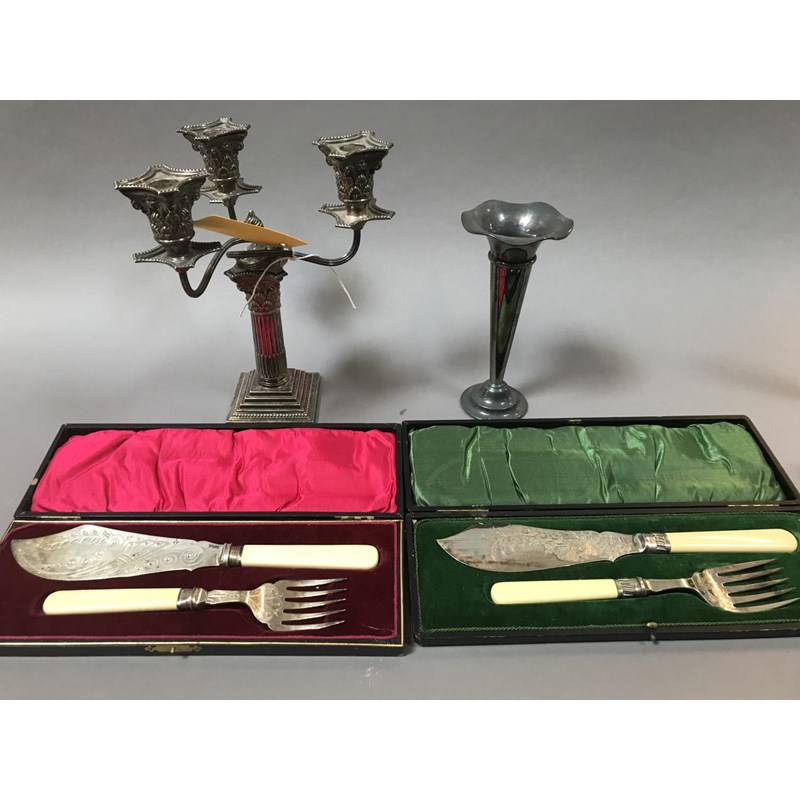 Silver Plated Triple Branch Candelabra, Spill Vase and Two Cased Fish Servers (4)