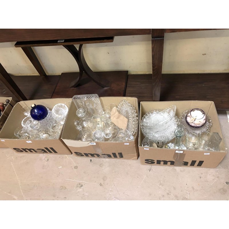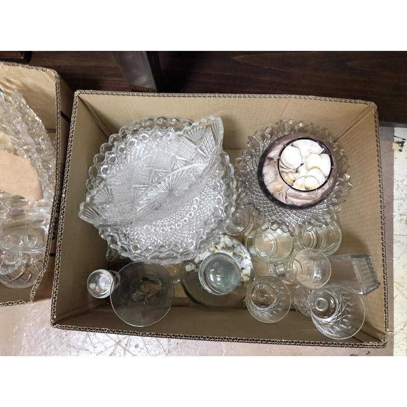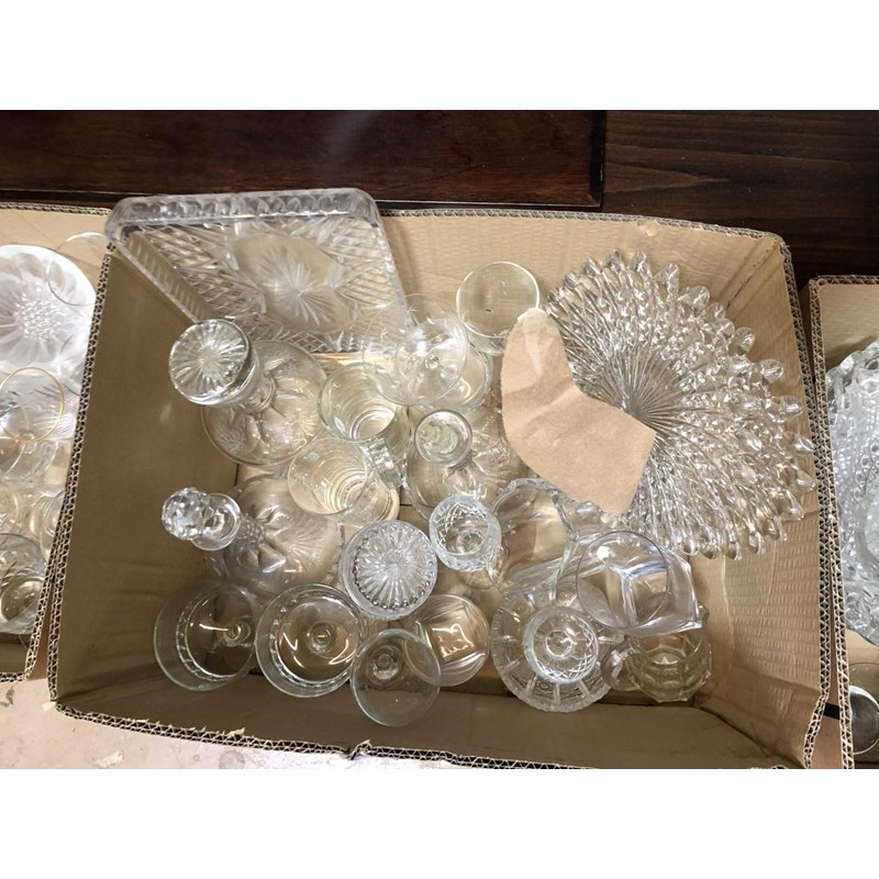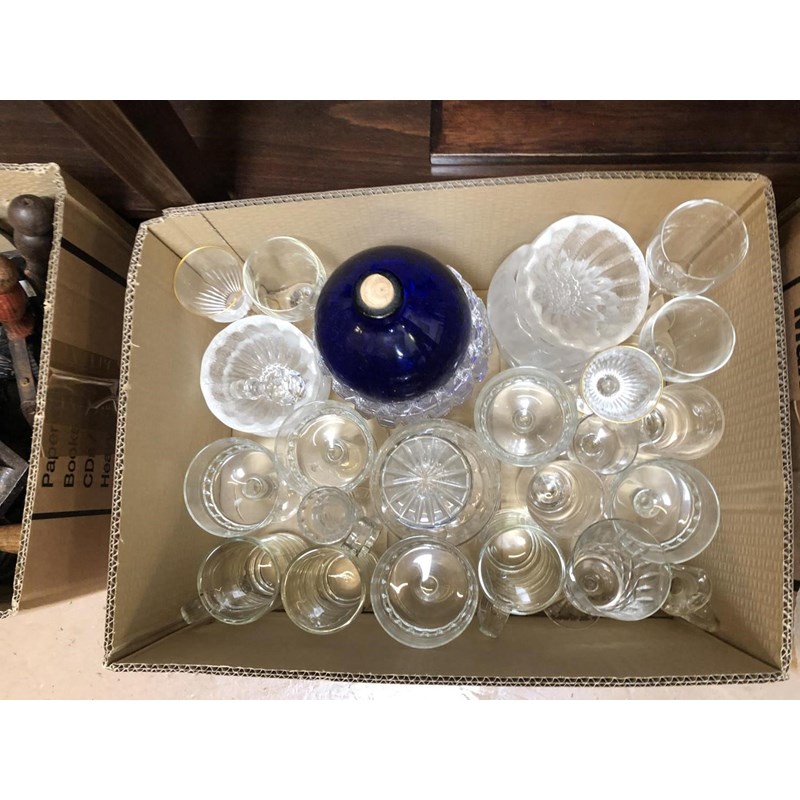 Three Boxes of Glassware, Decanters, Drinking Glasses, etc