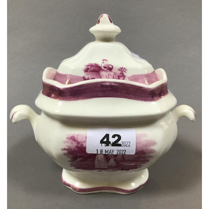 Puce Lustre 1830's Sugar Basin and Cover, Transfer Printed with 'The Mother', Height 16cm
