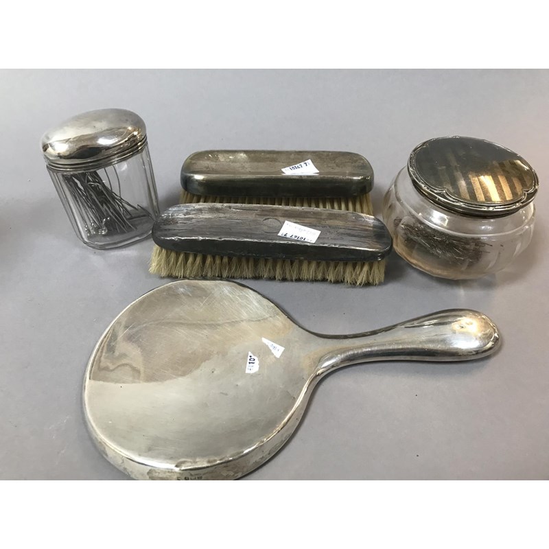 Silver Lidded Powder Jar, Hand Mirror, Silver Topped Jar and Two Clothes Brushes