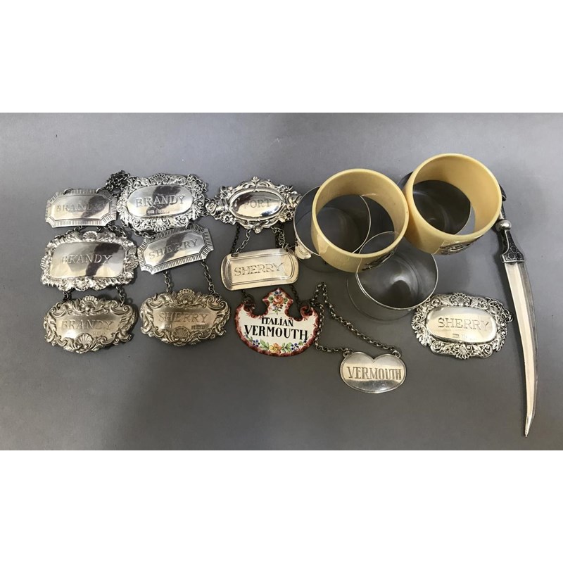 Three Egyptian napkin rings, two mounted resin napkin rings, ten various 20th century wine labels, an enamelled copper wine label, an Iraqi niellowork paper knife in the form of a dagger, monogrammed and dated "BAGDAD 1935"; the latter 6" (15.2 cms) long; 7.65 oz weighable silver (lot)