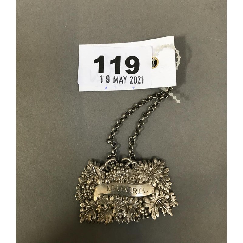 with vine leaves and grapes and the scroll title area, incised "MADERIA"*, by Joseph Wilmore, Birmingham 1830; 1.8" (4.6 cms) long; 0.25 oz