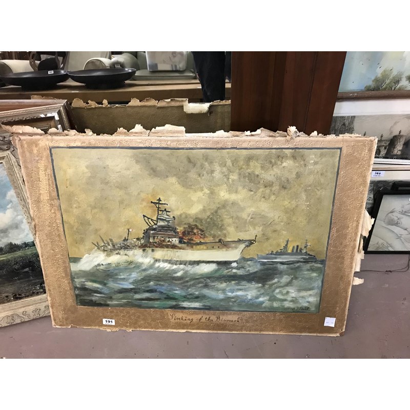 Oil on Board, Naive Naval Scene, Sinking of the Bismark (Spelt Wrong in Title), signed J.S Neal 50cm x 75cm