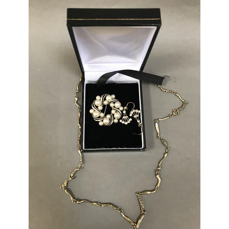 Pair of Paste Drop Earrings, a Cultured Pearl Brooch and a Gilt Metal Chain