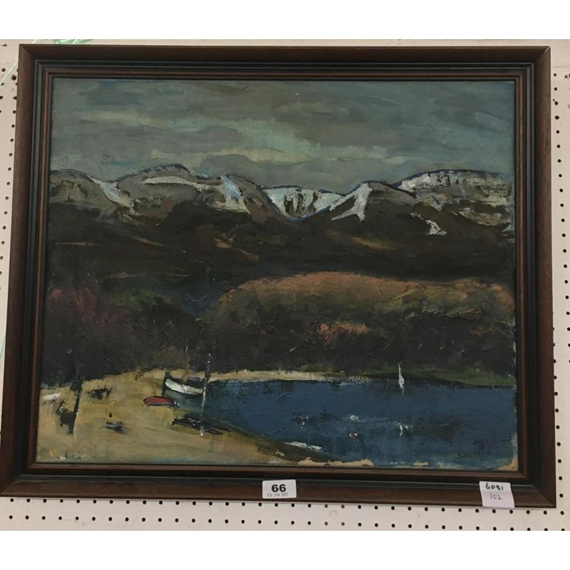 Oil on Canvas Boats by a Lake Shore with Mountains in the background, signed 'Setford'