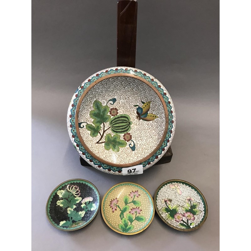 Chinese Cloisonne Bowl with Flower, Leaf and Insect Decoration and Three Small Dishes