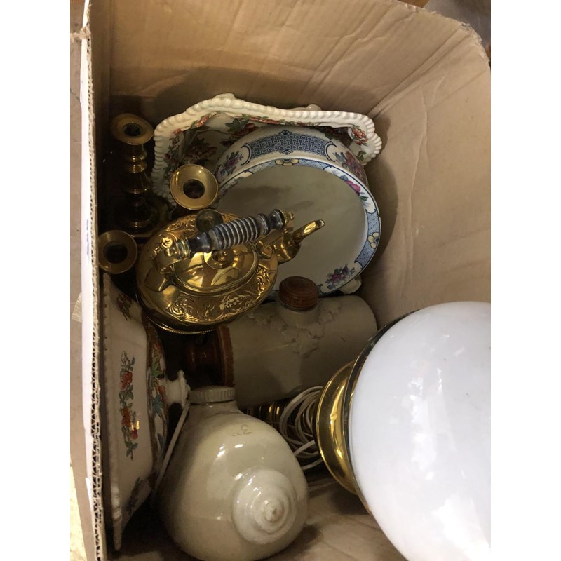 Box of Assorted Brassware, China to include Brass Candlesticks, Kettle, Ceramic Dishes etc