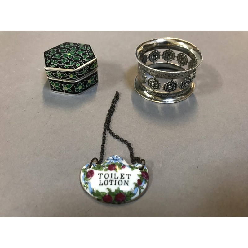 Napkin Ring, Enamel Box and a Scent Bottle Label