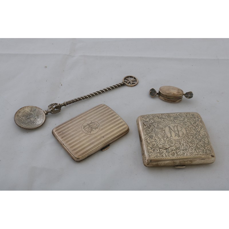 Two Silver Cigarette Cases, Pill Box and Spoon, 6ozt