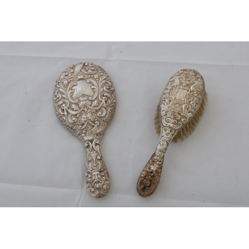 Victorian Silver Backed Hand Mirror and Hairbrushes (2)