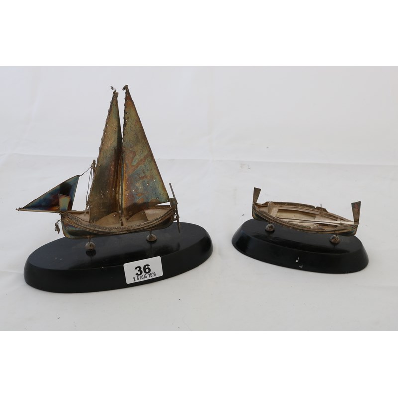 Silver Model of a Chinese Schooner together with another Silver Model of a Rowing Boat