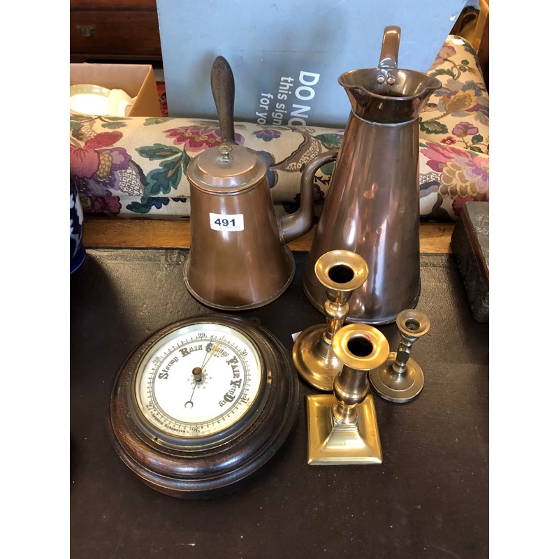 Candlesticks, Barometer, Copper Jugs