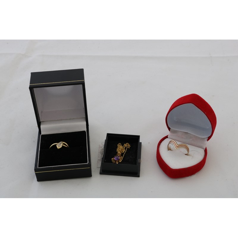 9ct Snake Ring, Amethyst Pendant and Three Tone Gold Ring (3) (3.5g Gross)