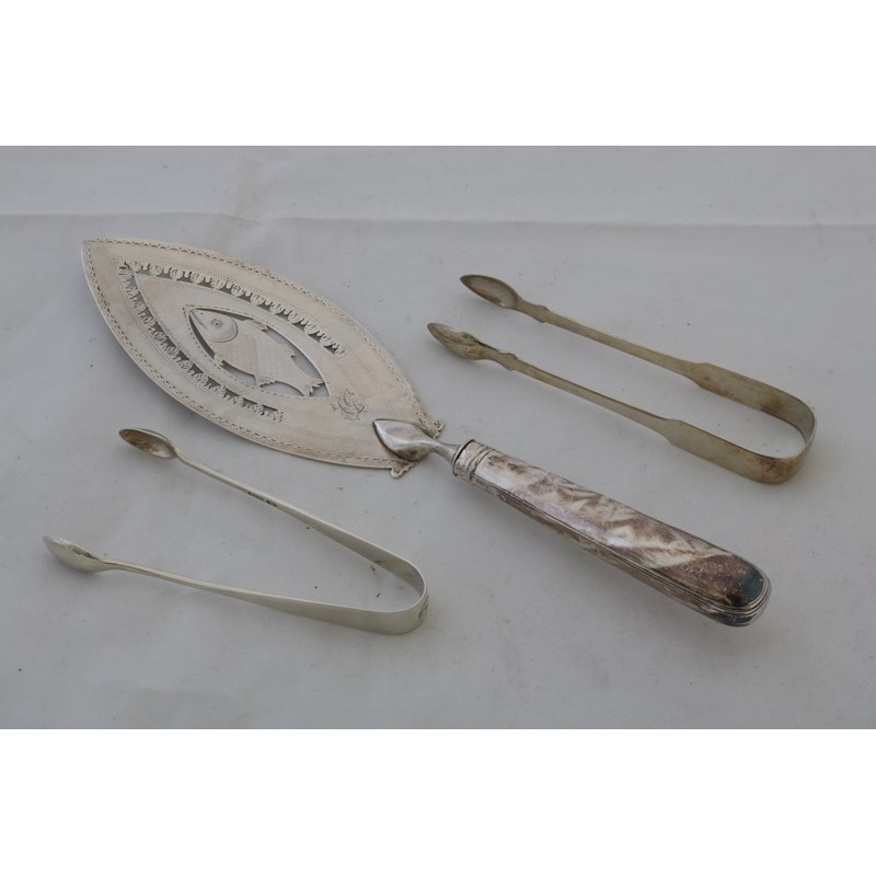 Silver Fish Slice and Two Pairs of Sugar Tongs