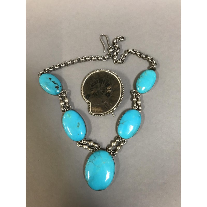 Eastern Silver Turquoise Necklace and an Ammonite Brooch