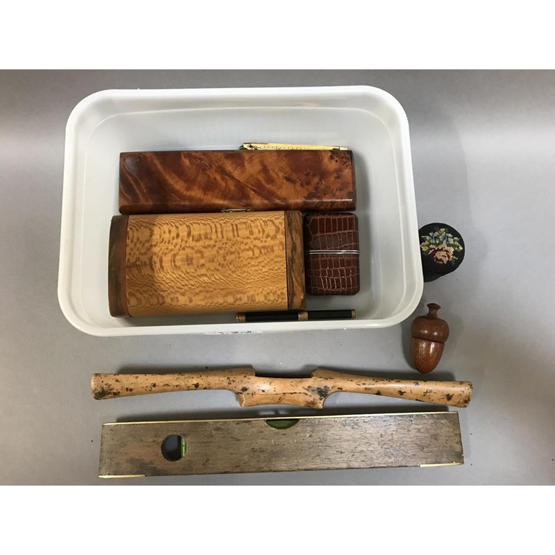 Mixed Lot: Two Fruitwood Boxes, Travel Clock, Spirit Level, Treen Acorn etc
