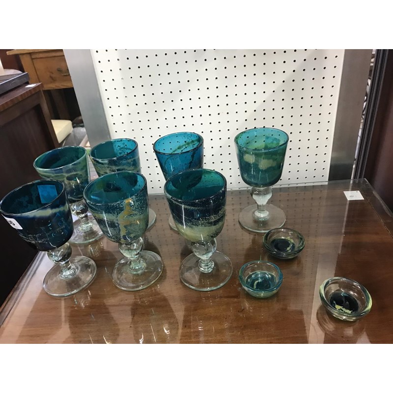 Seven 1970s Coloured Glasses and Three Small Ash Trays
