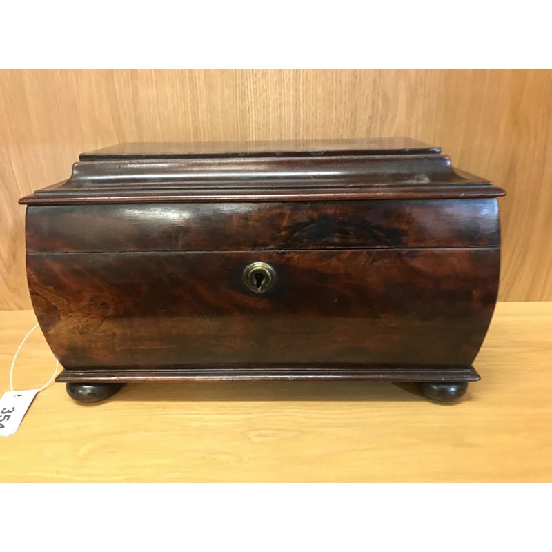A REGENCY MAHOGANY TEA CADDY, with stepped sarcophagus top on bun feet, height 19cm, width 32cm