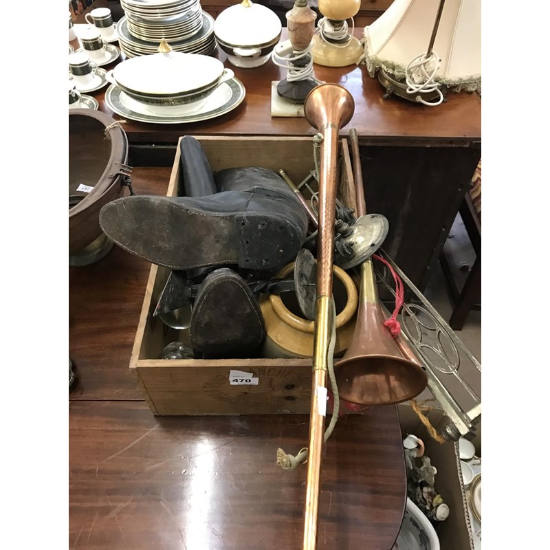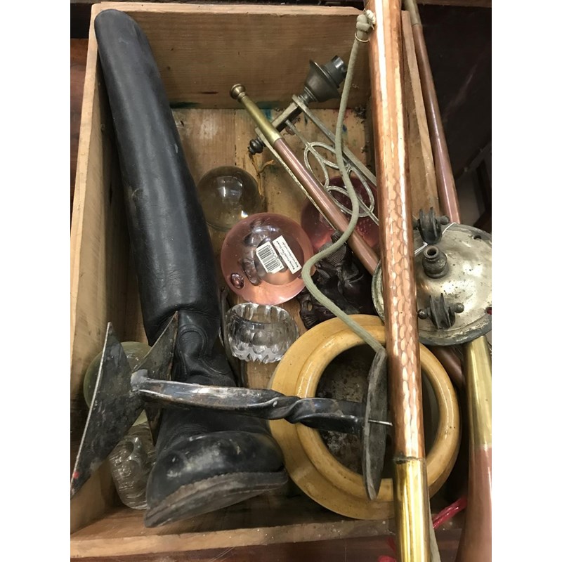 Box of Assorted Collectables to include Paperweights, Riding Boots, Copper Horns etc