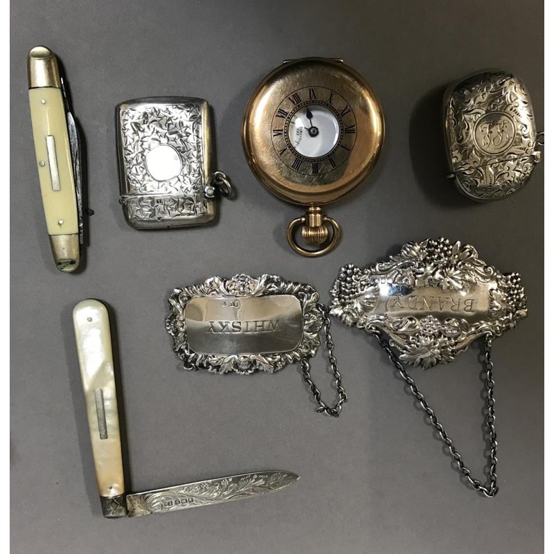 Mixed Lot: Silver Wine labels, Silver Vestas and Fruit Knives etc