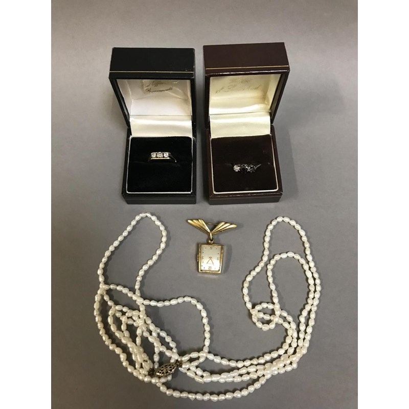 Two Gem Set Rings, Cultured Pearl Necklace and Watch