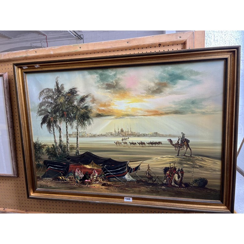 Framed Oil on Canvas, Arab Landcape With Camels, Signed Indistinctly, dated 2002