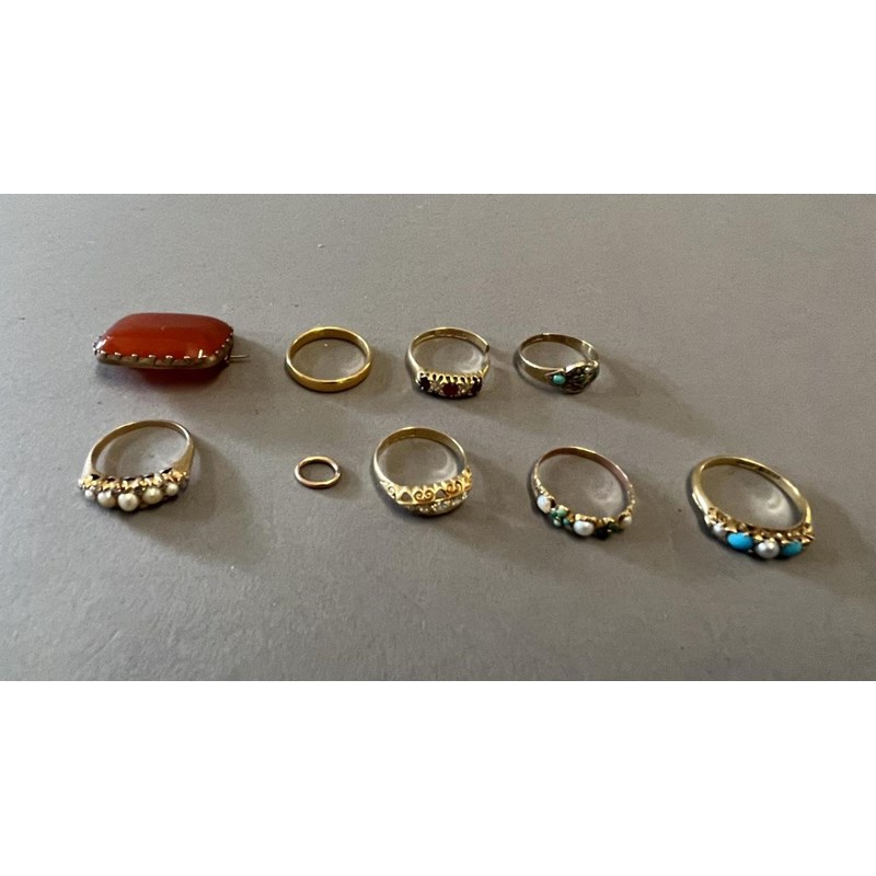 Three 18ct Gold Rings, a 10ct Ring and Two Others and an Agate Brooch