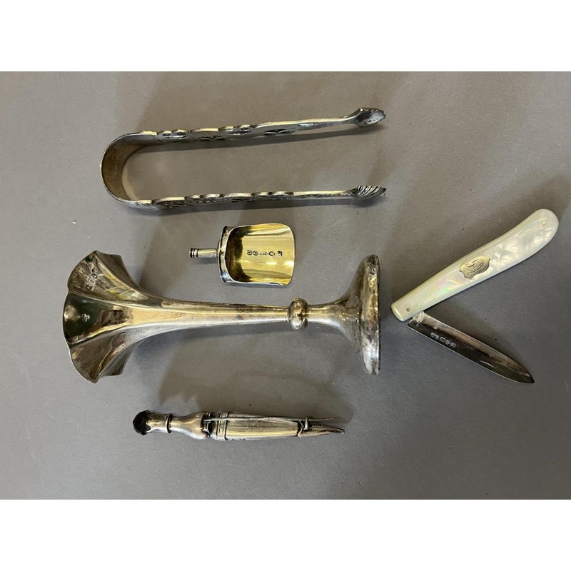 Silver Shovel Caddy Spoon, Sugar Tongs, Loaded Vase, Fruit Knife etc