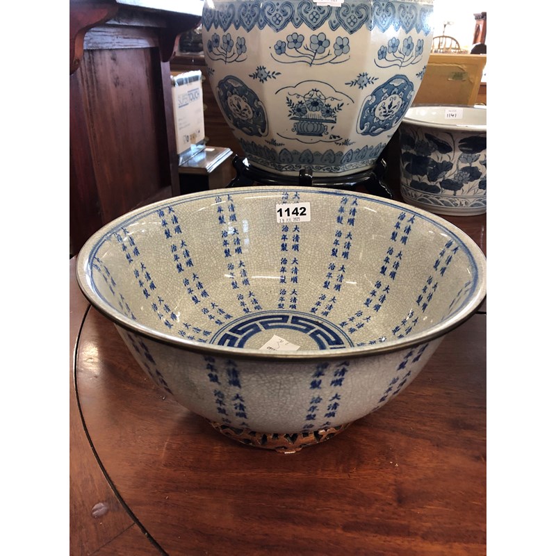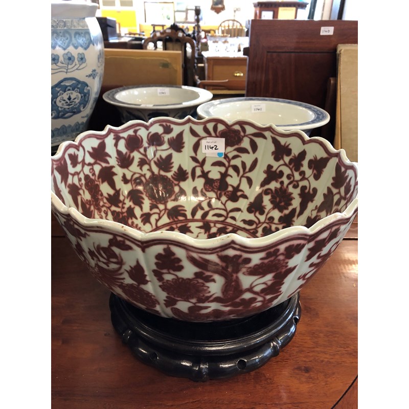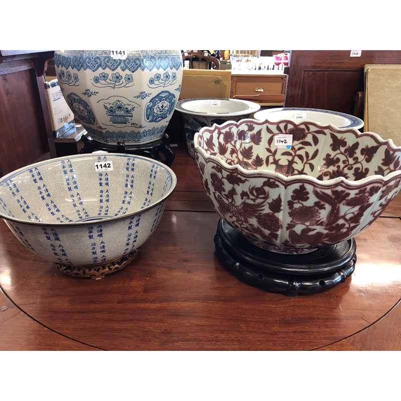 Two Chinese Bowls with Lines of Script, both on Hardwood Stands