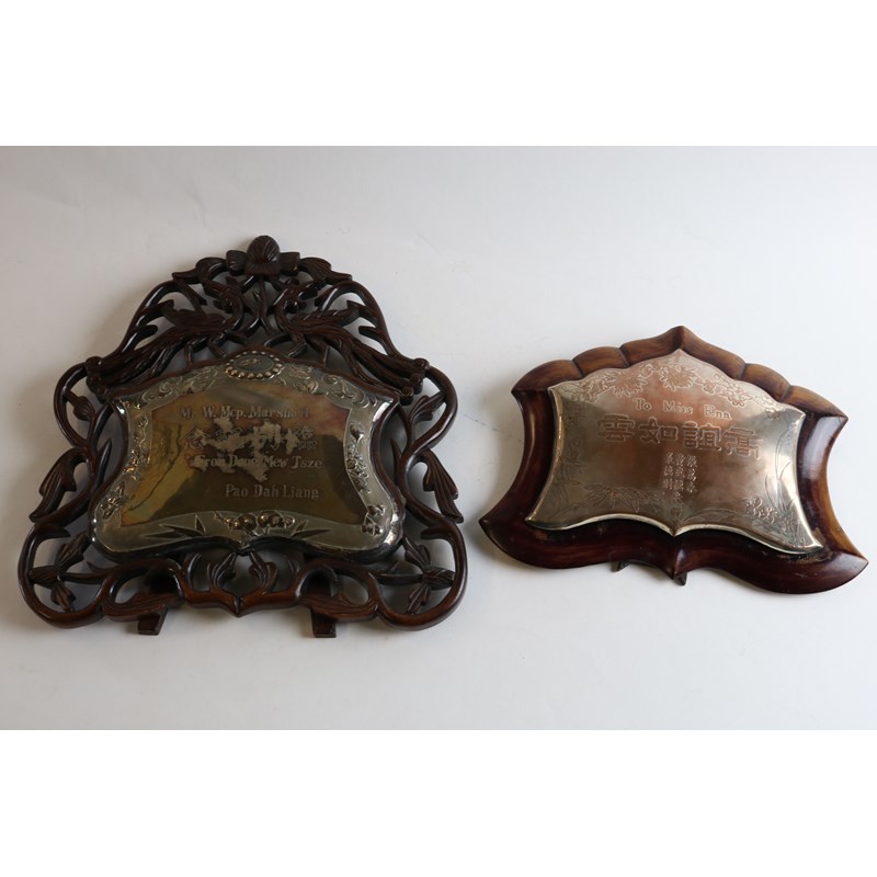 Two Chinese White Metal Presentation Plaques Mounted in Hardwood Frames