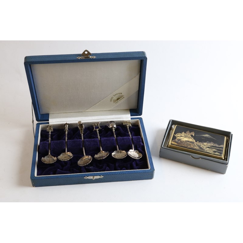 Cased Set of Six Japanese Teaspoons with Charm Finials and Leaf Bowls marked Sterling together with a Clover Musical Compact (2)
