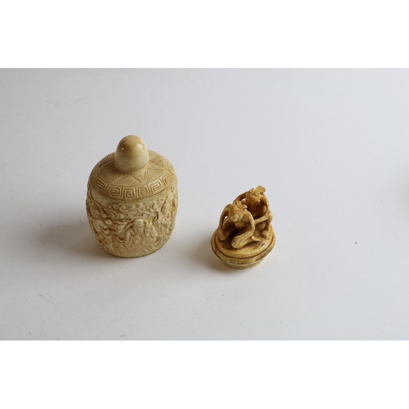 Carved Chinese Converted Ivory Snuff Bottle, the top lifting to reveal an Okimono of a Couple Engaged in a Sexual Act