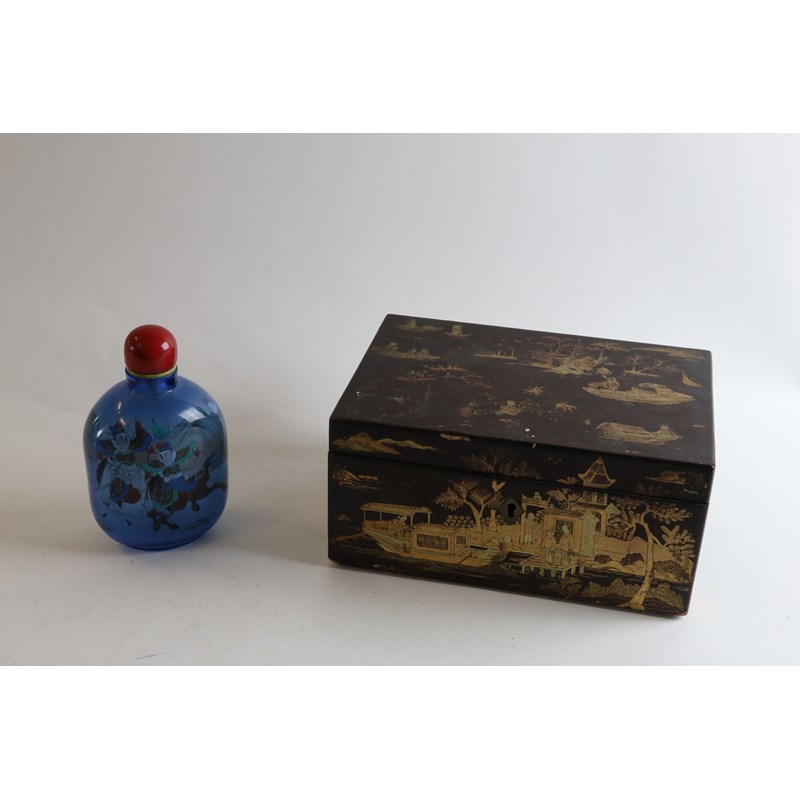 Chinese Lacquered Tea Caddy dipickting Village and River Scenes: together with a Large Chinese Painted Snuff Bottle depicting Warriors on Horseback (signed)