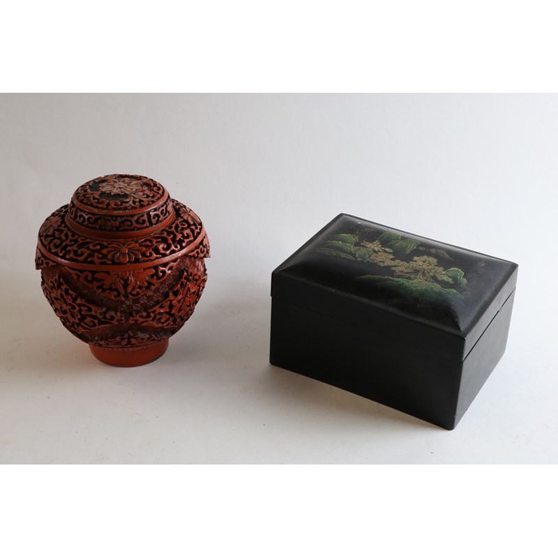 Chinese Cinnibar Lacquered Vase and Cover together with a Chinese Lacquered Nest of Boxes