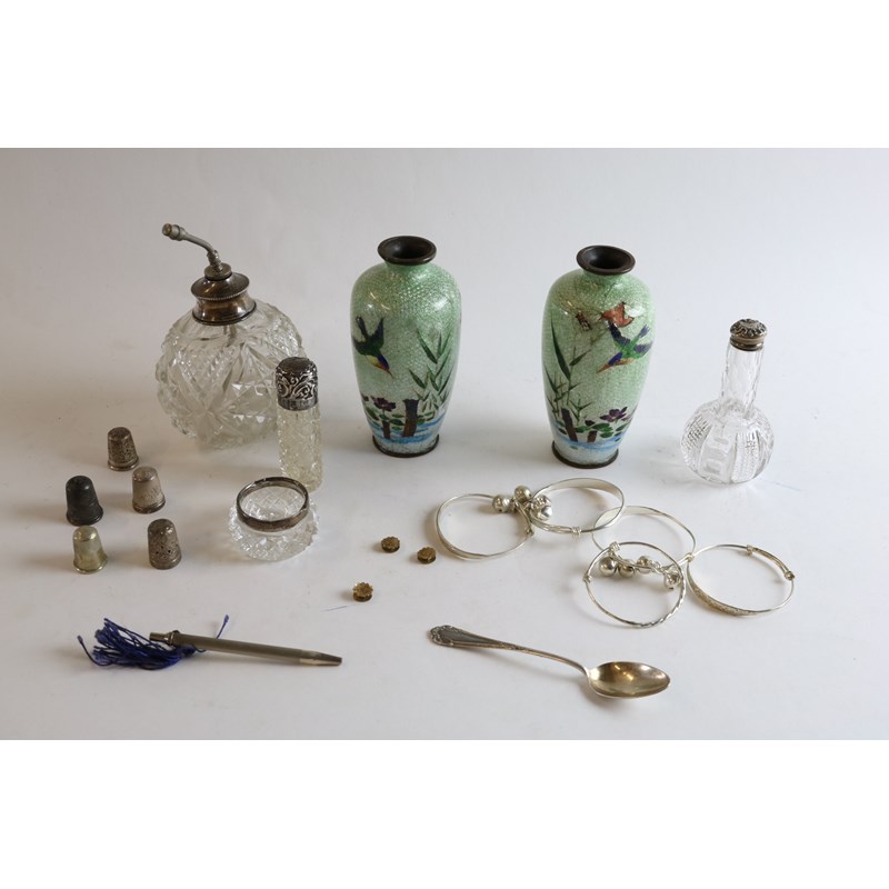 MIxed Lot: A Pair of Chinese Cloisonne Kingfisher Vases and a Carved Ivory Napkin Ring and Assorted Silver Collectables